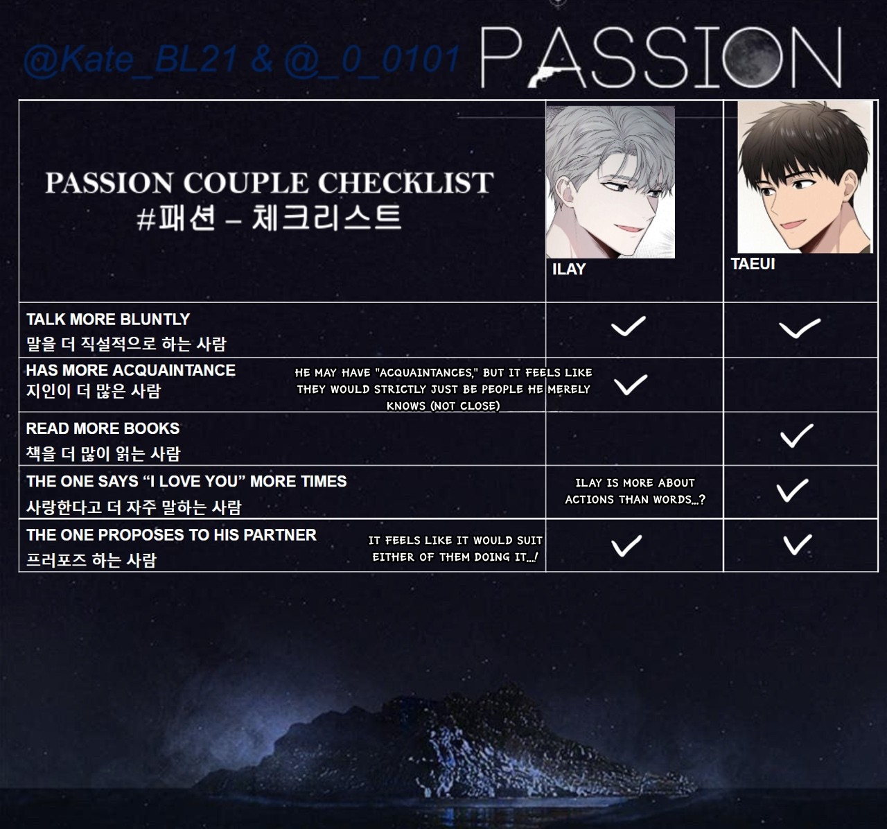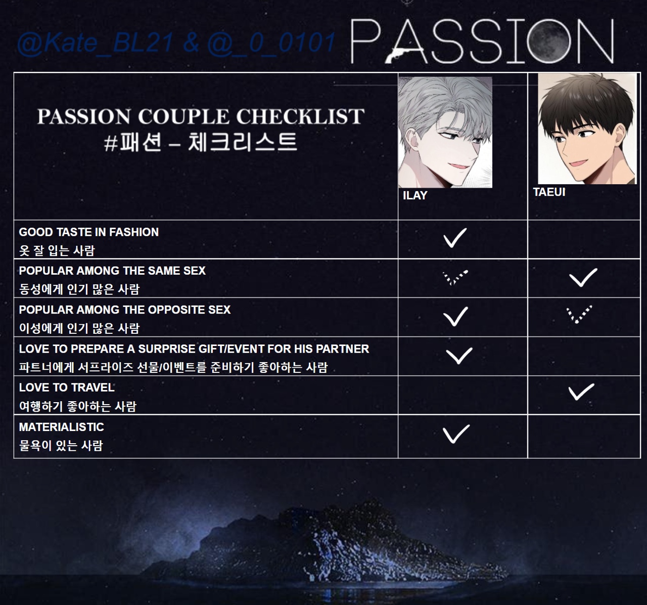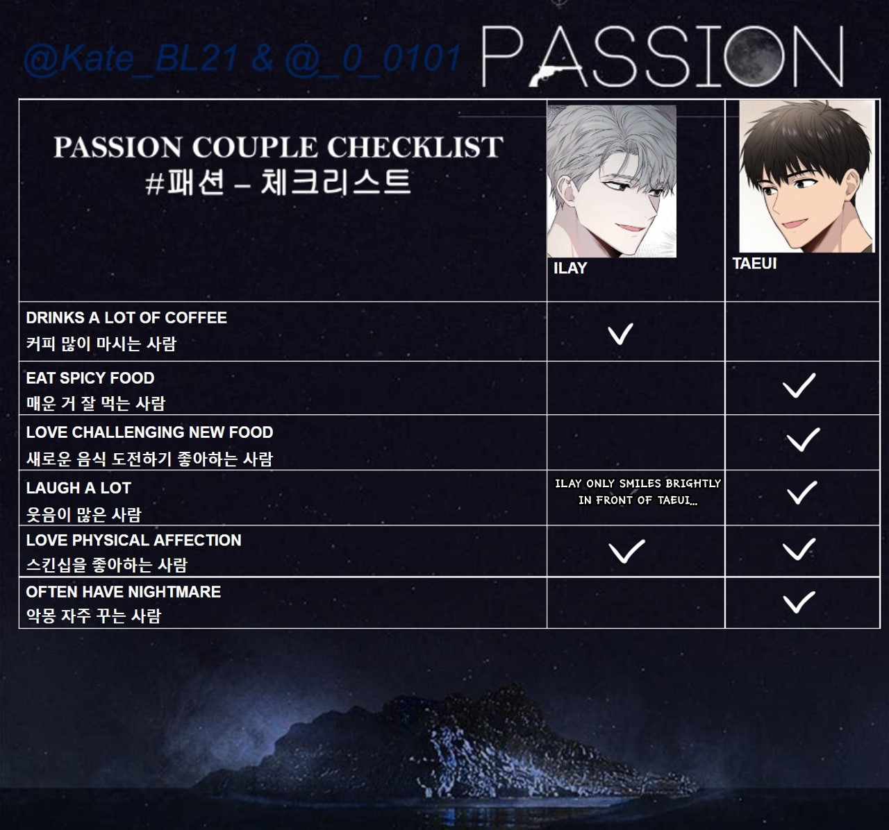 This checklist reflects Kangjak-nimβs personal views (the artist of Passion), so thereβs no guarantee it completely matches the views of Yuuji-nim (the novelβs author) (Λ΅ Ν‘~ ΝΚ Ν‘Β°Λ΅)οΎββ‘*:ο½₯γ.