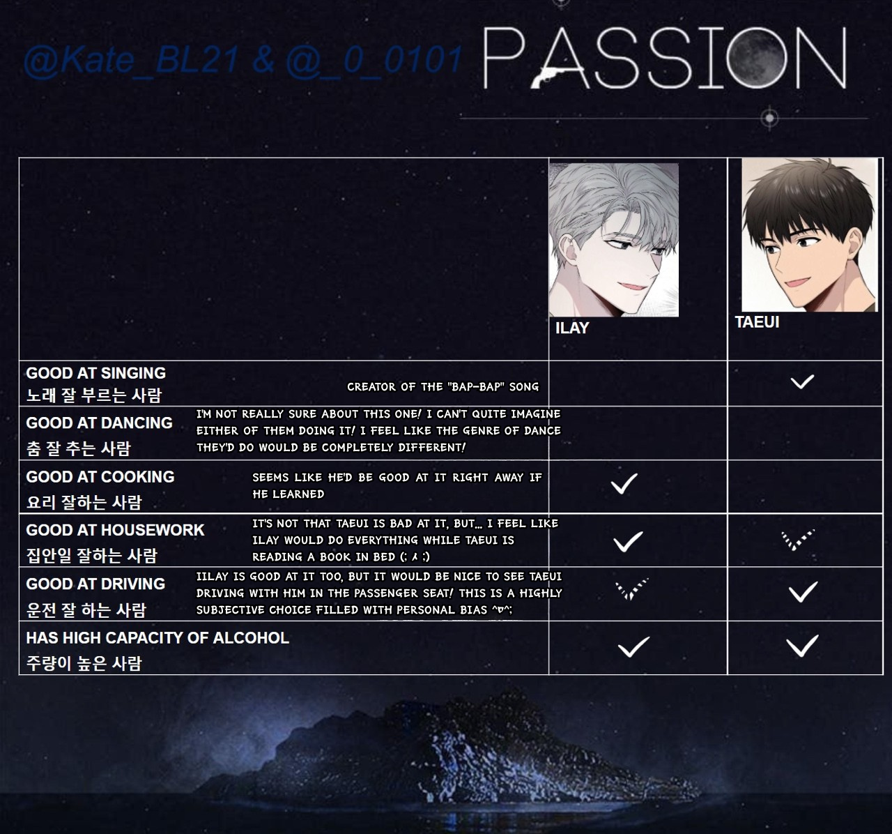 Note (under Ilay’s column): Ilay only smiles brightly in front of Taeuiβ¦
