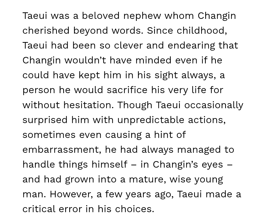 Taeui was a beloved nephew whom Changin cherished beyond words. Since childhood, Taeui had been so clever and endearing that Changin wouldn’t have minded even if he could have kept him in his sight always, a person he would sacrifice his very life for without hesitation. Though Taeui occasionally surprised him with unpredictable actions, sometimes even causing a hint of embarrassment, he had always managed to handle things himself – in Changin’s eyes – and had grown into a mature, wise young man. However, a few years ago, Taeui made a critical error in his choices.